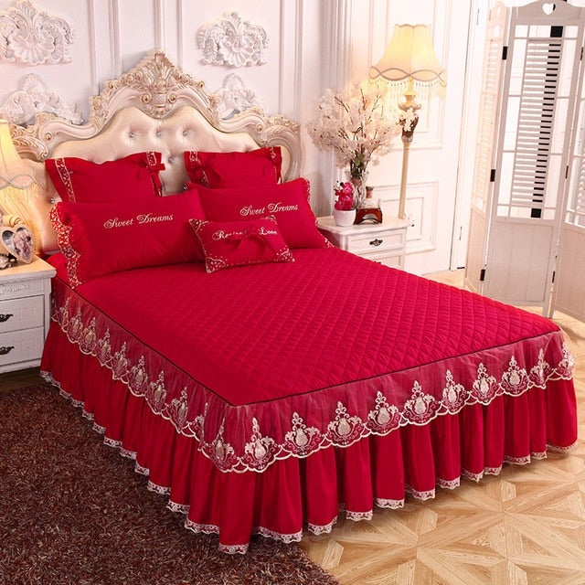 Luxury Gray Red Pink Solid Color Silky Tencel Modal Quilting Lace Bed Skirt Bedspread Bed Sheet Bed Cover Pillowcase Bedding Set